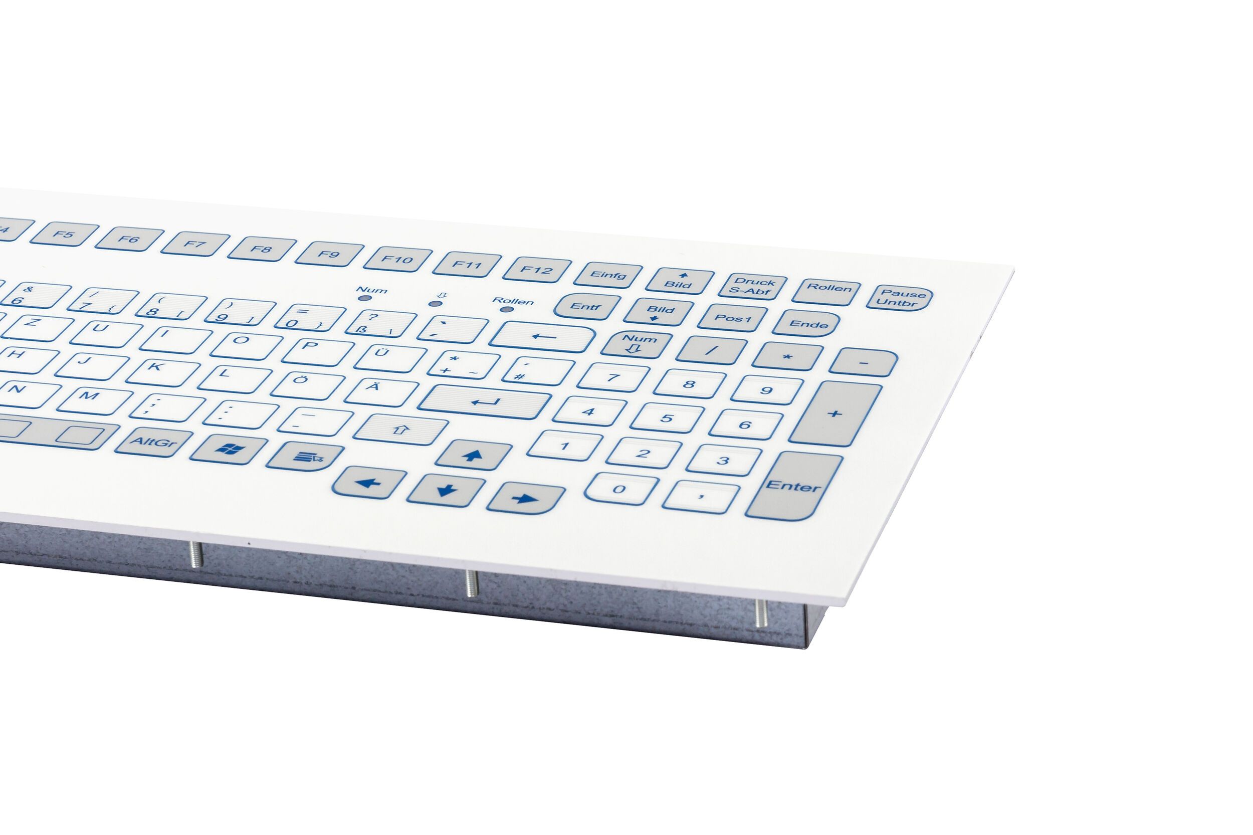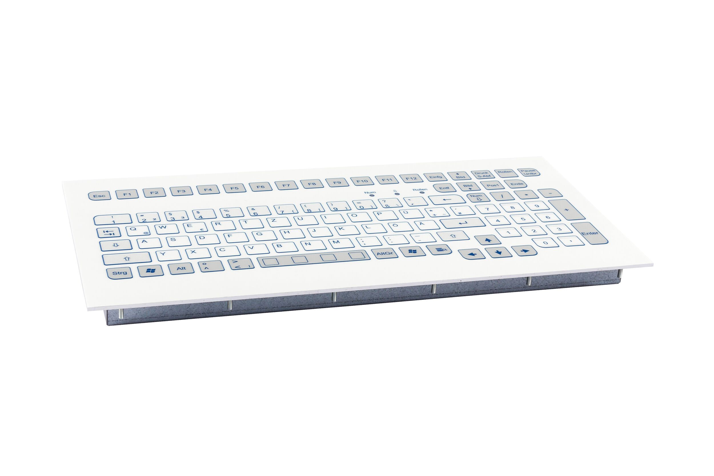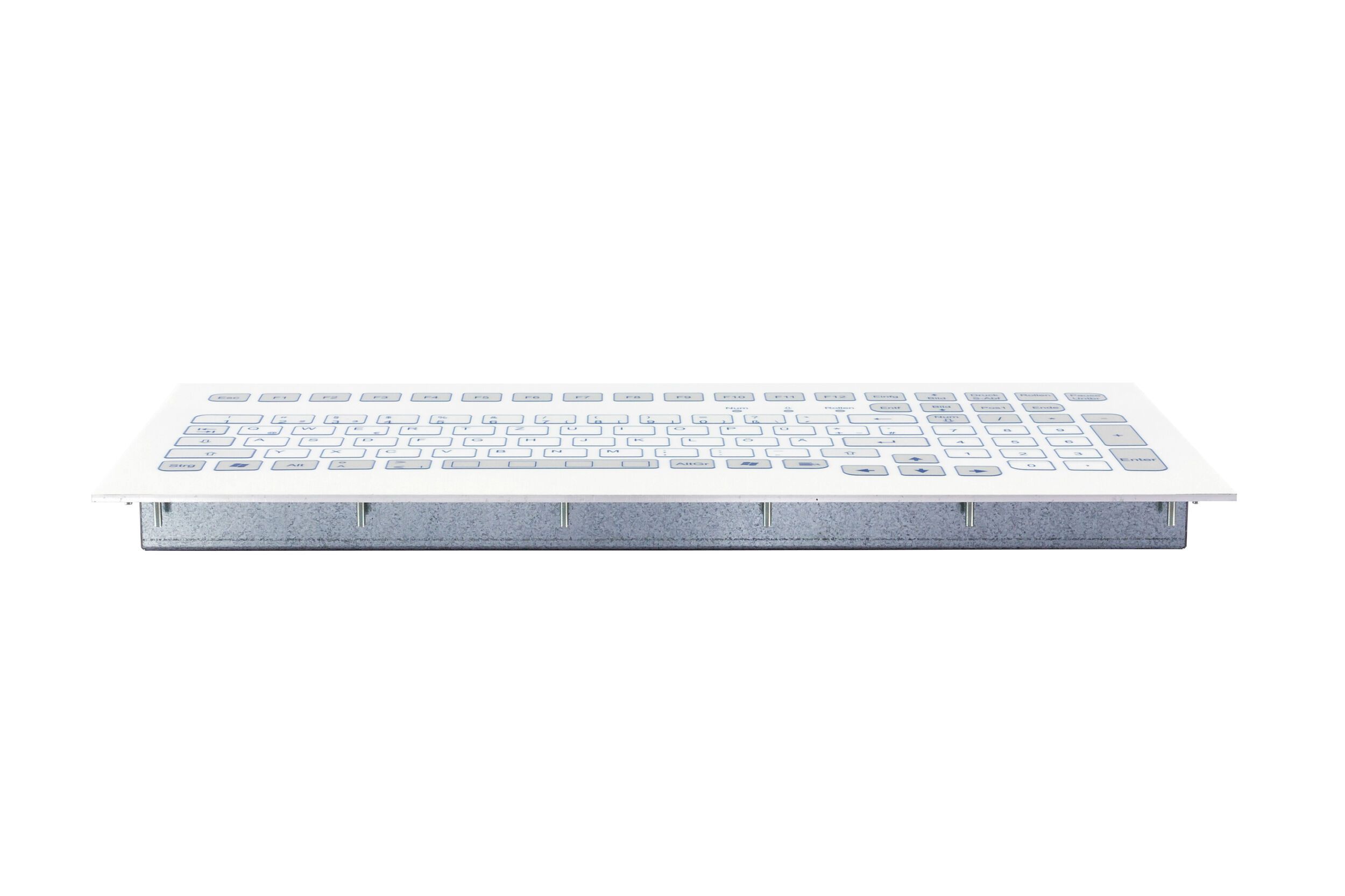 Compact membrane-covered front-mounted keyboard with robust short-travel keys