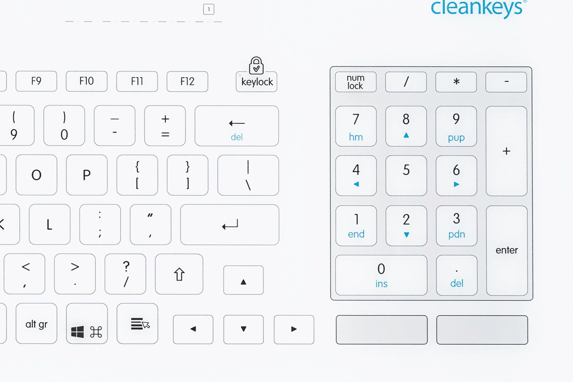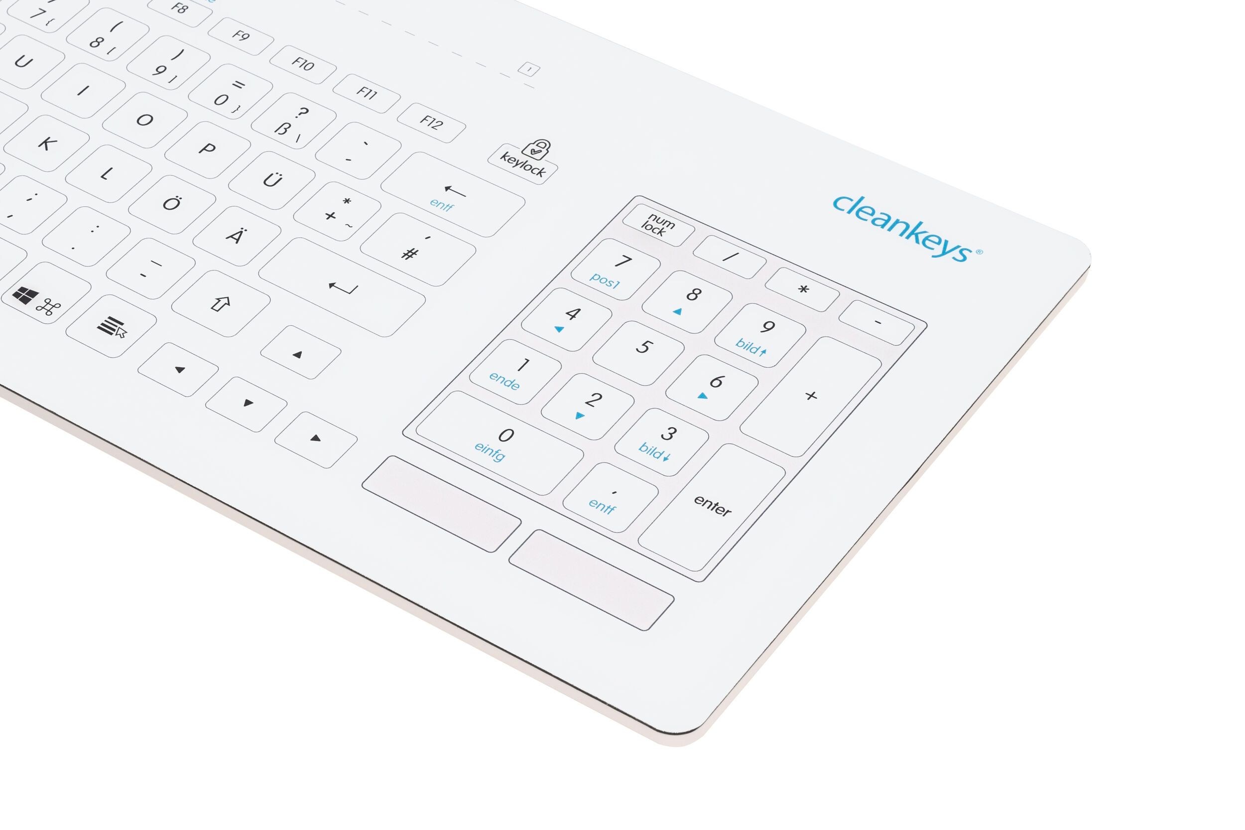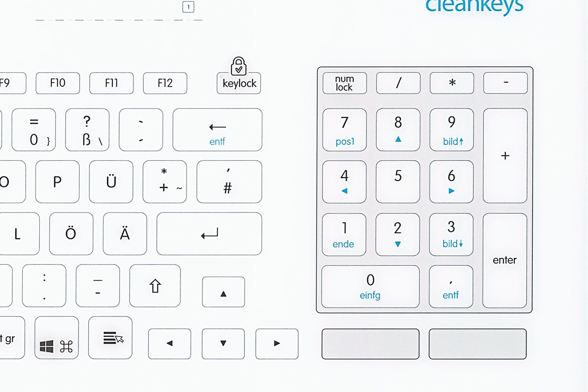 The new CK5 continues the famous Cleankeys® series and impresses users with its smart design and no compromises regarding hygiene. Compact dimensions and a generous touch pad/numpad area make it possible to operate the unit without a PC mouse and destine the CK5 for use in situations where space is particularly restricted. It is the ideal solution on mobile trolleys for doctors’ rounds and hospital wards or cramped medical workplaces.