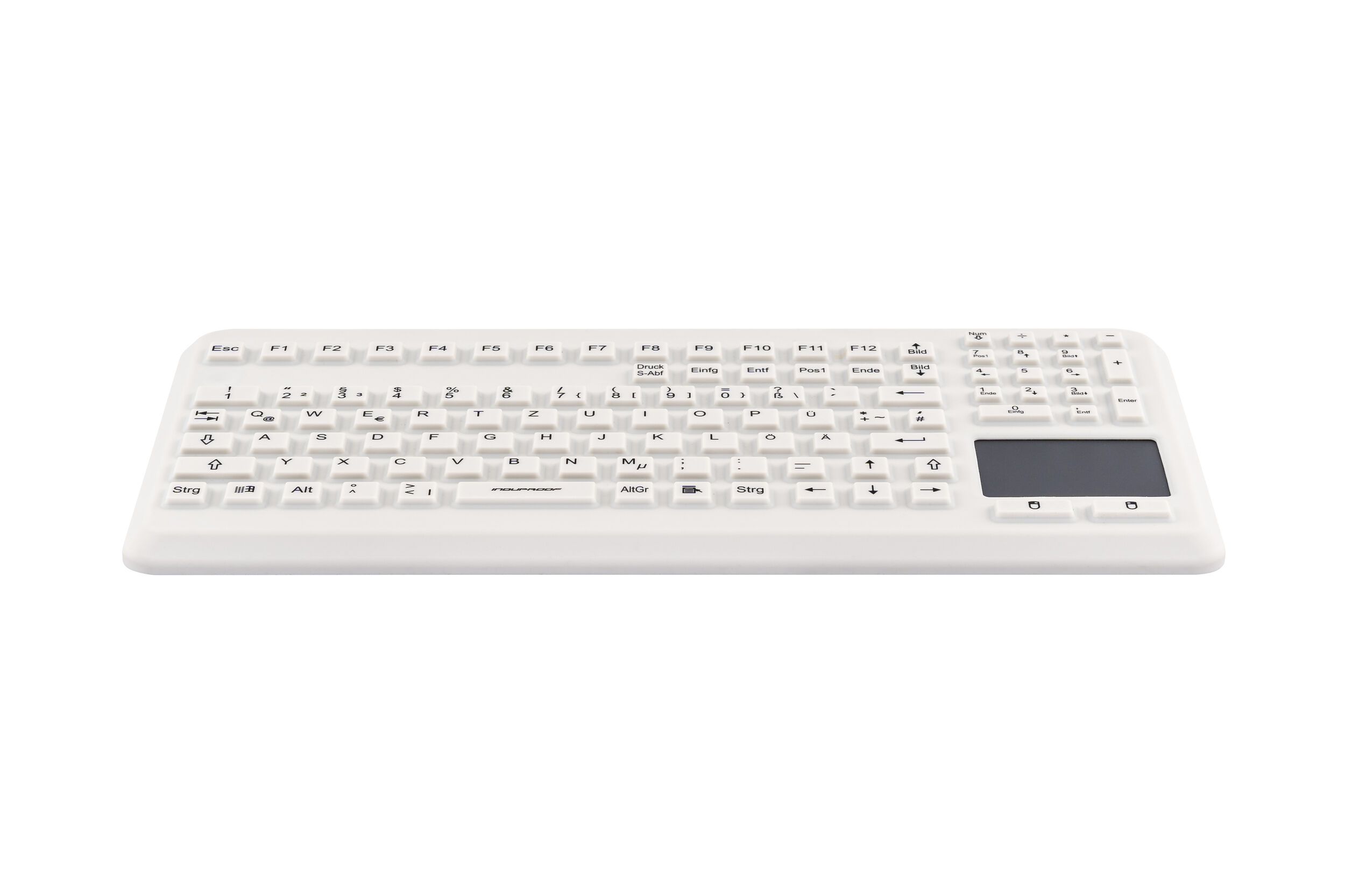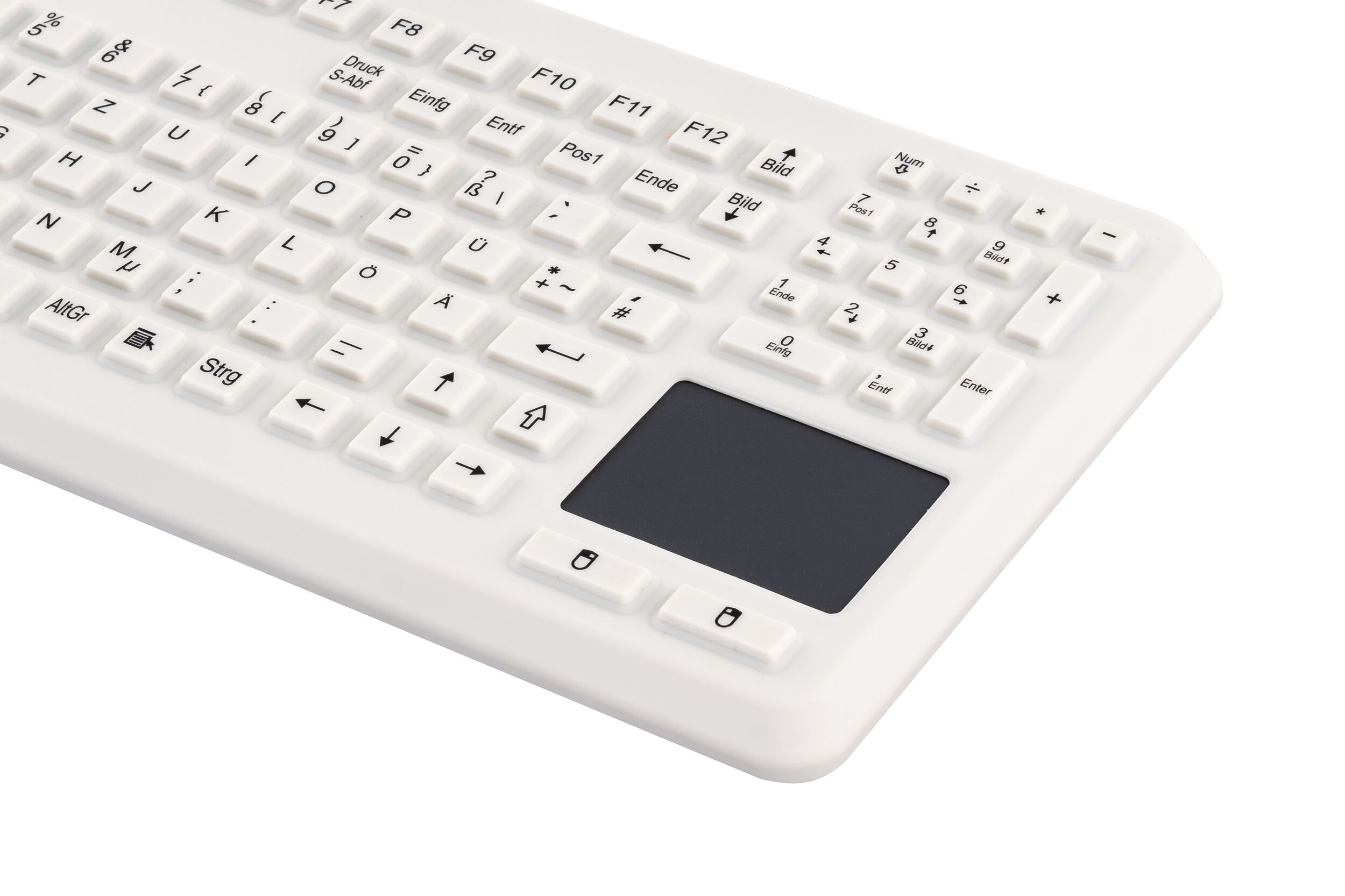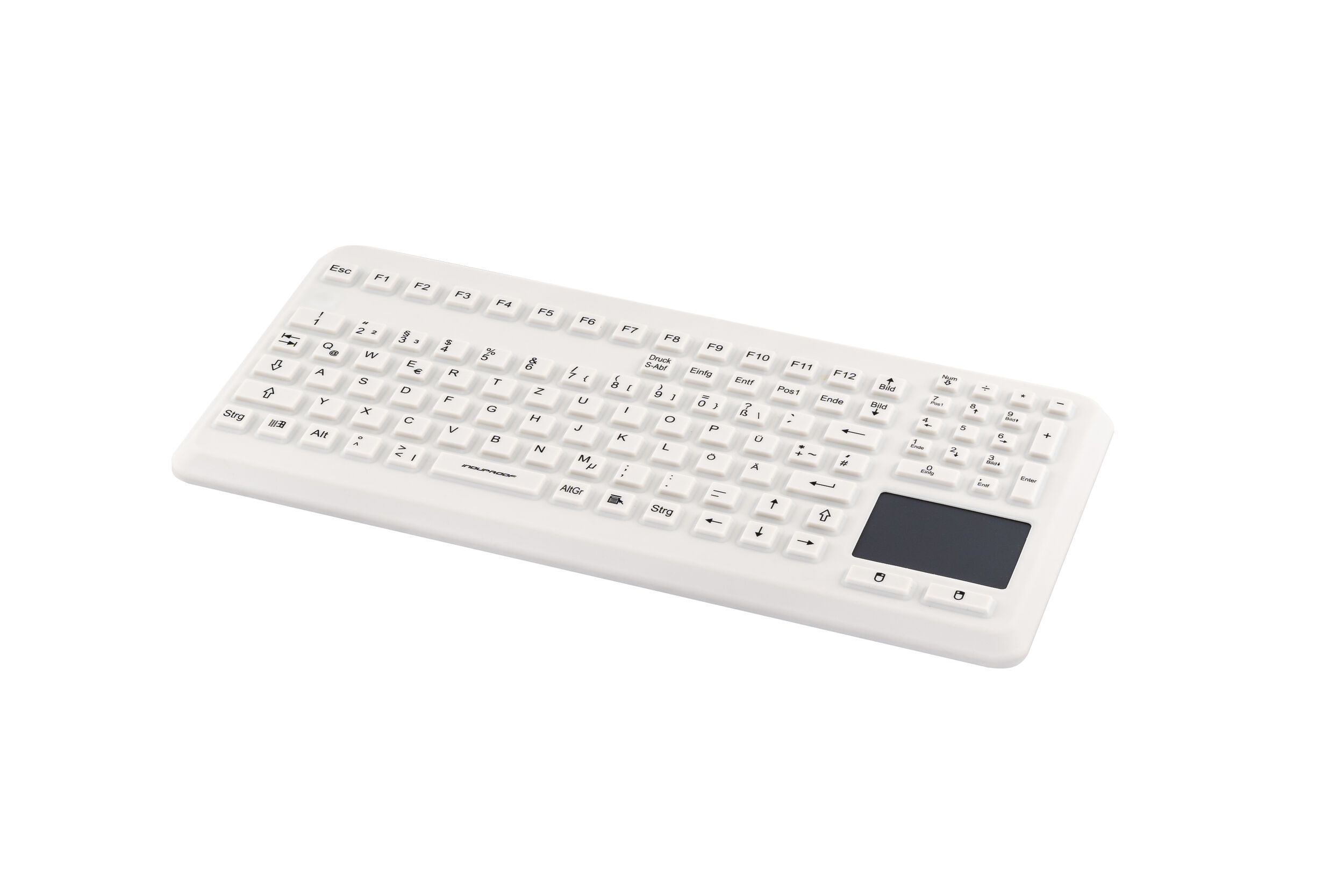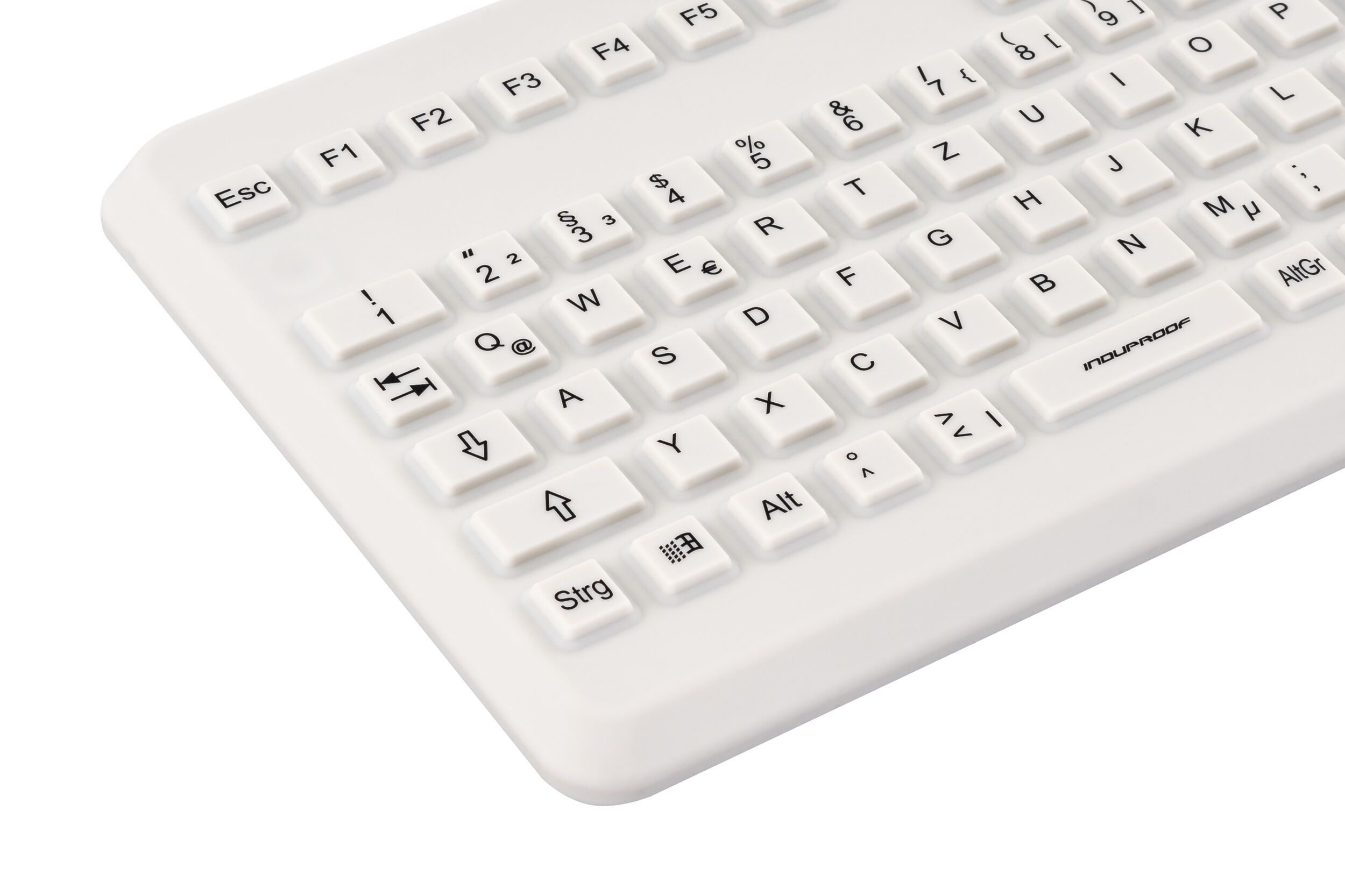 The InduProof® Advanced keyboard has a complete set of keys with numeric keypad, an integrated touchpad and convinces with a pleasant feel and the highest degree of protection. Its robust design makes it ideal for use in demanding hygiene-sensitive areas such as industrial food and beverage production. High-quality workmanship and the use of high-quality materials in this keyboard ensure a long service life.