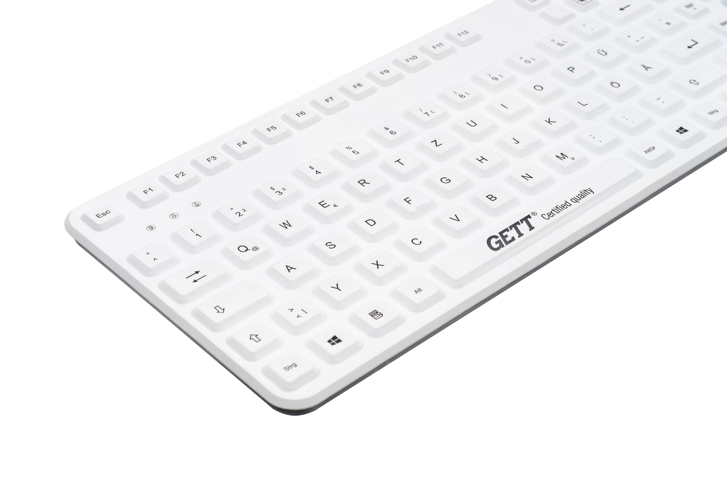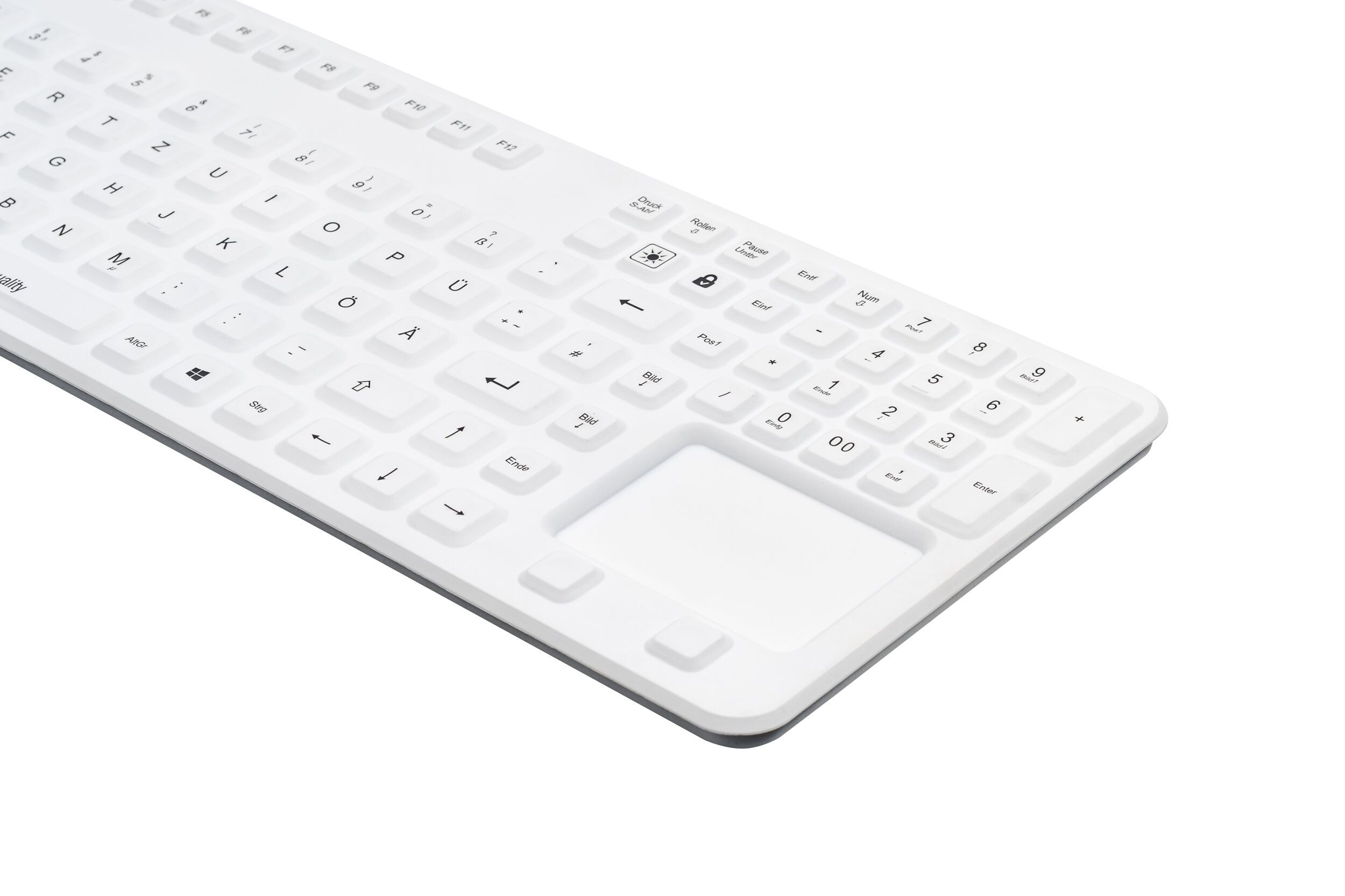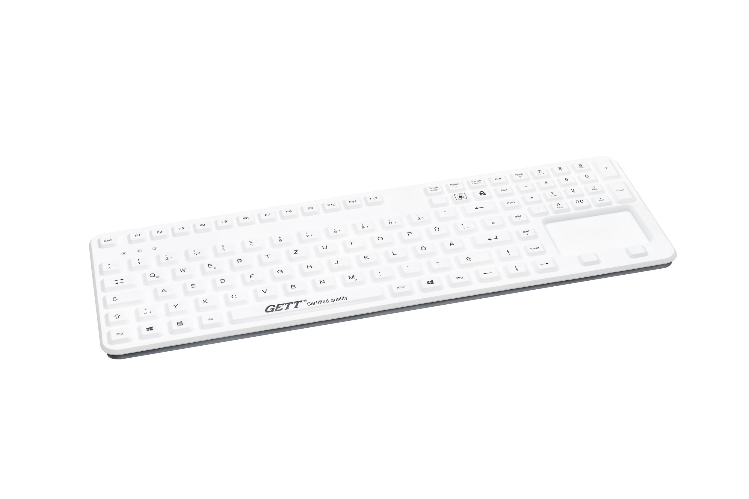 The Cleantype® Prime Panel+ (TKG-109-GCQ-PR-TOUCH-ADH-WHITE-IP68-BACKL) silicone keyboard for insertion helps create a hygienic working environment. Its surface is waterproof and dustproof and can therefore be thoroughly cleaned and disinfected. The keyboard also impresses users with special product features. It can be attached to magnetic surfaces in a flexible way and is suitable for darkened environments where space is cramped thanks to its incremental lighting function and its slim design. Thanks to the touch pad, there is no need to use an additional mouse. It provides the writing comfort of an office keyboard.