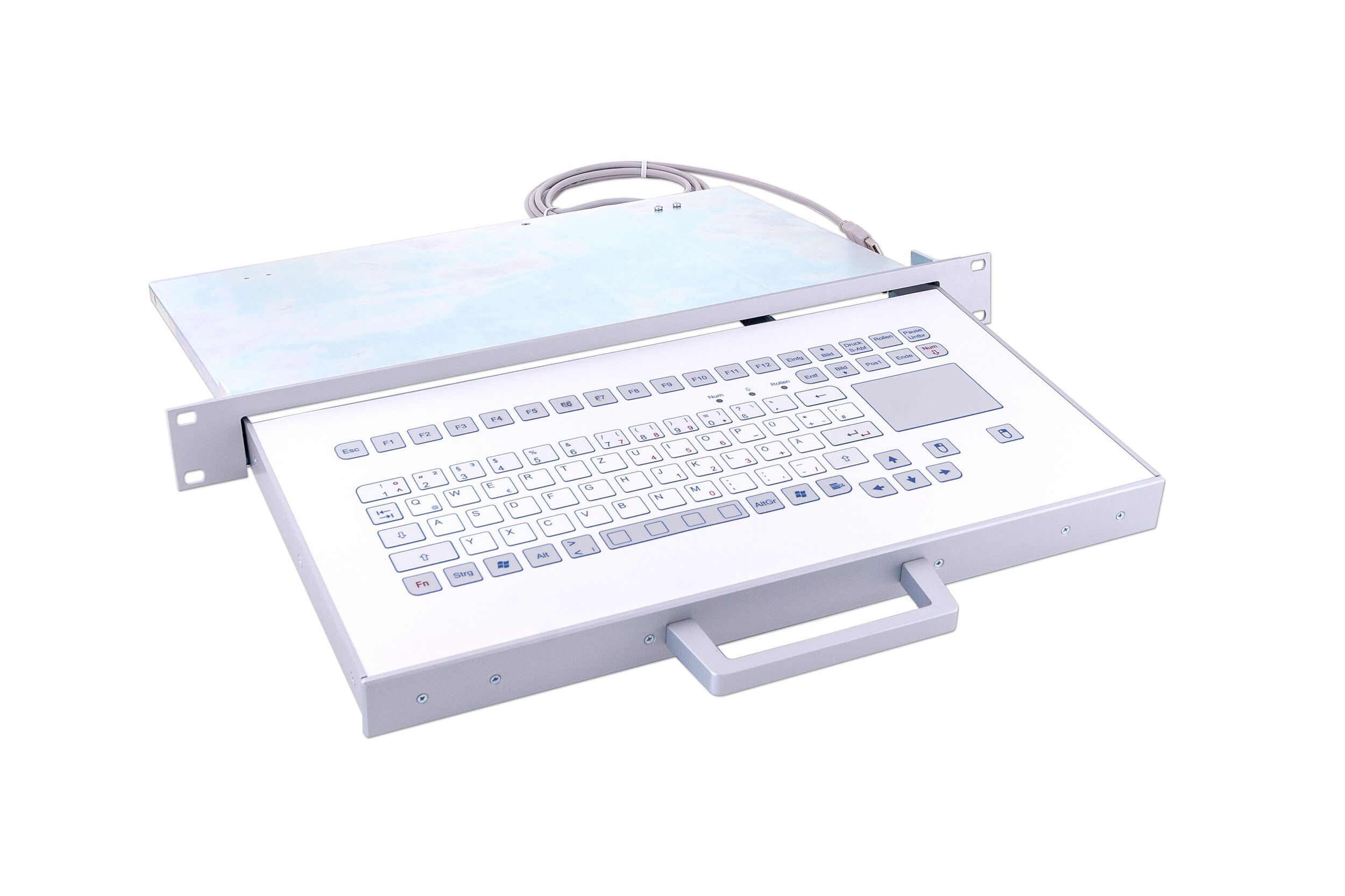 Compact membrane-covered keyboard in 1U 19-inch drawer with robu…
